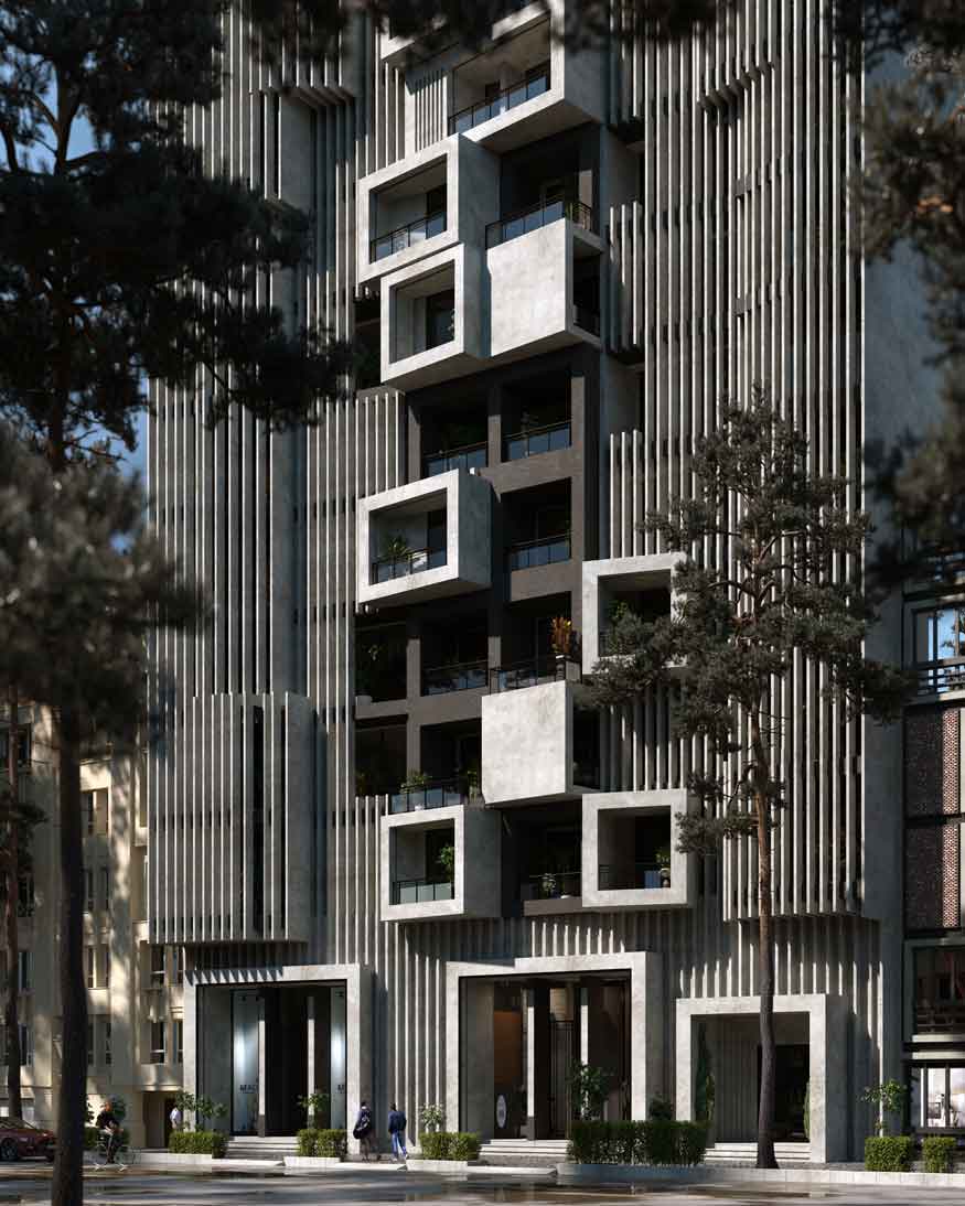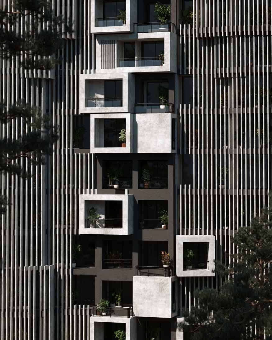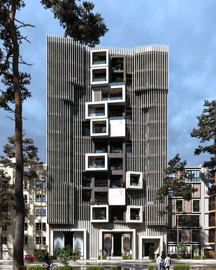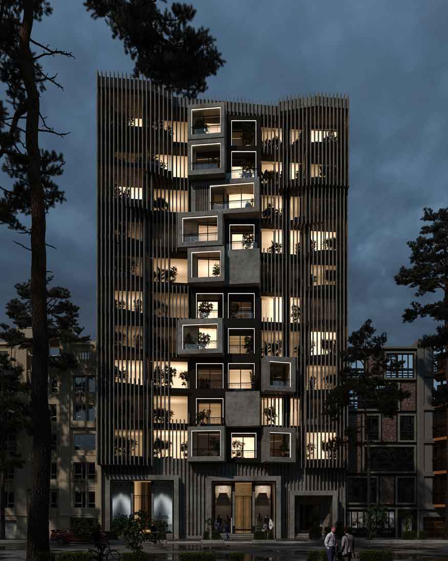 .2در طراحی نمای این برج از کنتراست بصری بین خطوط عمودی که در زمینه کار قرارگرفته و باکس