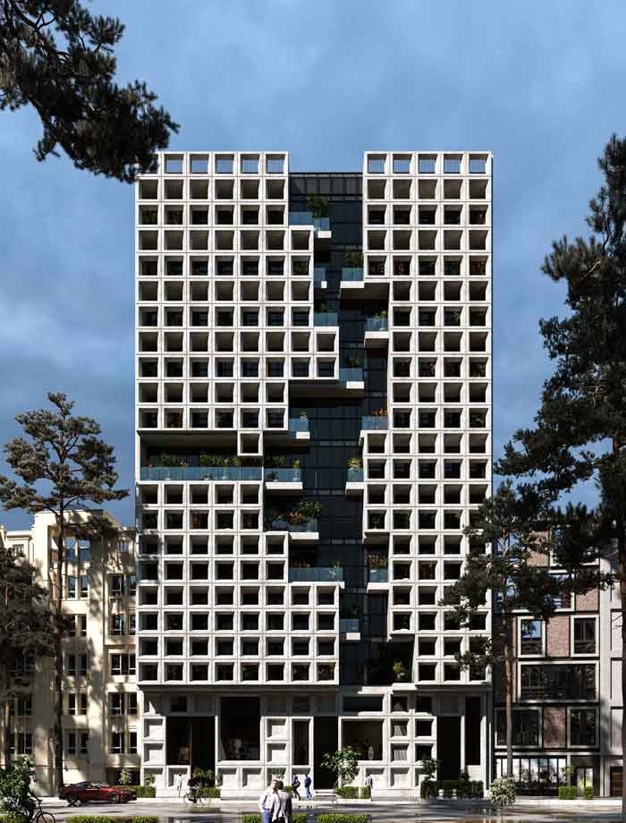 این پروژه به صورت یک مسابقه میان چندین شرکت معماری که توسط کارفرما انتخاب شده بودند، کارفرما به دنبال طرحی شاخص برای نمای پروژه ی خود بود که این پروژه را به یک عنصر شهری خاص تبدیل کند. این پروژه پیش از اینکه وارد طراحی نما شود سازه ی آن توسط طراح سازه تکمیل و وارد مراحل اجرایی سازه شده بود، که این خود از چالش های طراحی این نما به حساب می آید چرا که در این حالت محل قرارگیری تیرها و ستون ها به طراح تحمیل میشود. روش ایده آل برای طراحی یک ساختمان برای اینکه به یک عنصر شهری تبدیل شود این است که از ابتدا طراحی ان توسط طراح نما طراحی شود و طراح با توجه به نیاز خود برای ایجاد فضاهای مثبت و منفی در نما ، پلان و سازه را مطابق آن تغییر دهد و سپس با تعامل با طراح سازه کلیه ی طرح های معماری و سازه را به جمع بندی برسند.
