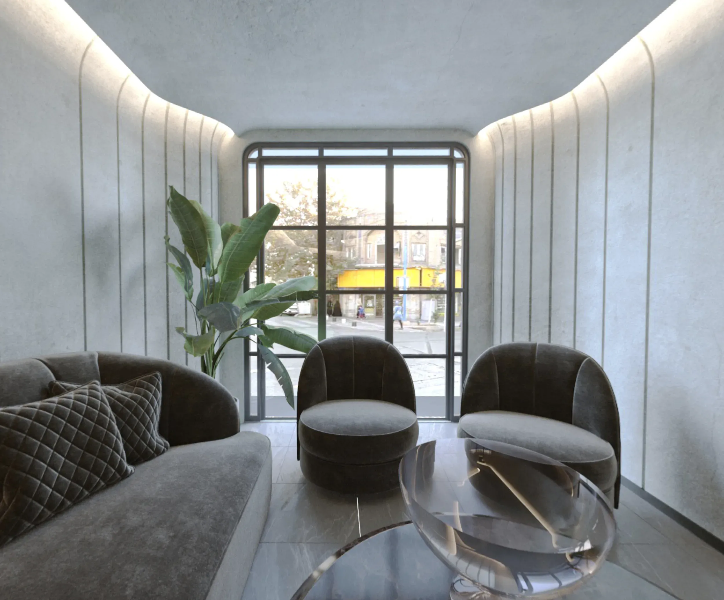 در این طرح با جایگزین کردن اشکال منحنی به جای خطوط شکسته، همچنین استفاده از یک متریال واحد در سراسر پروژه و عدم استفاده از تعدد متریال و همچنین استفاده از نور یکنواخت غیر مستقیم سعی در از بین بردن شکستگی های متعدد و افزایش خوانایی و کاهش تاثیر هندسه ناقص در پروژه شده.